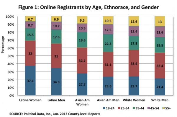 To quote a new study, "A larger proportion of Latinas/os under 35 registered online than whites or Asian Americans of any gender."