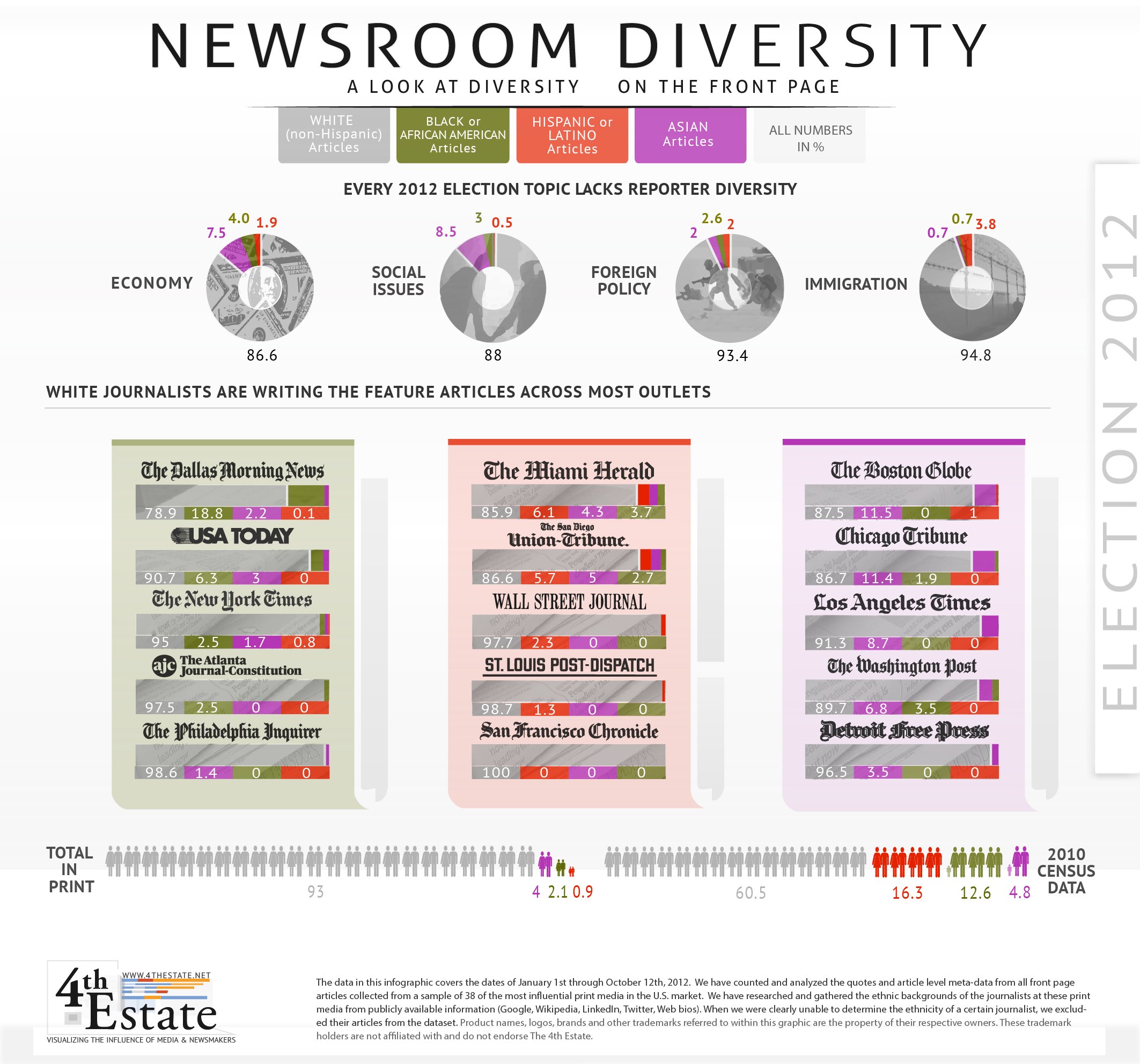 A project from 4thEstate.net found that less than 1% — .9% — of front page print articles covering the 2012 presidential election were written by Latinos. Asian and African American reporters were represented in slightly higher numbers, but a whopping 93% of the stories were written by whites (Updated). And, we’d venture to say, the majority of those were written by men.